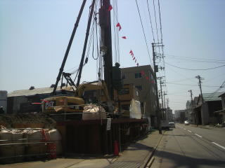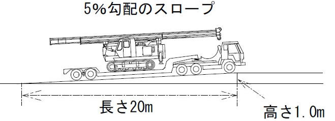 では、スロープの造成が可能な現場で、どのようにして勾配を形成すればいいか。大前提として、杭打機本体を積載する低床トレーラに合わせて勾配を切っていくのが原則になります。5%勾配というと、低床トレーラの全長は約17mあります。よって、入口の高低差を調べて、5%以下の距離を緩やかなスロープ状にして形成していきます。例えば、道路から1m高くなっている場合、5%勾配にするには20mのスロープが必要です。2mの高さであれば、倍の40mが必要になります。現場が広ければ、距離の長いスロープを螺旋状に作れば解消できます。ですが、現場狭かったり、物理的に不能な場合もございます。そういったケースの現場であれば、杭打機本体は、現場のスロープ手前で降し、自走しながらスロープを登る方法があります。ただし、安全上、交通量が一番少ない時間帯で、ガードマンを付けて作業しなければなりません。大型トラックは7%勾配がギリギリですので、7%以下の勾配にスロープを形成します。