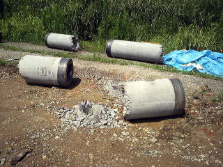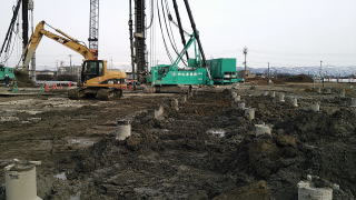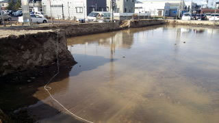 二つ目は、現場が広大で大雨が降っても、ちゃんと計算された排水システムを設ければ、とりあえず安心ですが、比較的狭い現場などでスキ取りや先行掘削をしてしまうと、前述にありますように、現場が水没してしまいますし、地盤にもよりますが、せっかく強固な地盤だったのが、その地盤を取り除く事で、下層の軟弱な地盤が露出し、杭打機が転倒する恐れがある為、地盤改良を施さなければならなくなります(特に粘土層・シルト層)。また水が抜けず高含水比のまま地盤改良を掛けますと、想定よりも多いセメント系固化材を使用するハメになり、改良した地盤が一枚岩のようになってしまい、根切が不可能となり、ブレーカーなどで破砕しながらの根切作業になることもあります。