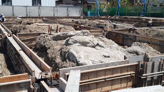 三つ目は、土間杭(床受け杭)がある場合、杭芯の出方にもよりますが、場合によっては杭打機に干渉してしまい、施工中に杭が折れてしまったり、施工が不可能になったりする場合もあります。また杭頭のGLが、表土から10㎝~30㎝しか潜っていない杭は、1本マスの杭ならいいのですが、2本マス・3本マスとなると、浅い杭頭の上に何度も乗らなければならないので、杭が沈んだり、細い杭だと折れてしまう可能性もあります。根切の際も、油圧ショベルが乱立する杭に阻まれて旋回作業が出来なかったり、浅い杭頭の上に乗らざる負えない場合、細い杭だと折れてしまう可能性もあります。
