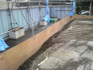 また、L型擁壁を打設しないとセメントミルクが溢れてしまい、隣地に流出する可能性が有る場合は、簡易土留めか矢板工事、安価で意外と役に立つのが単管にコンパネで止めるというやり方があります。