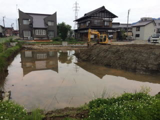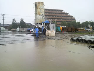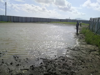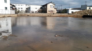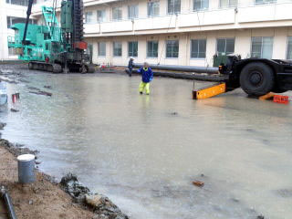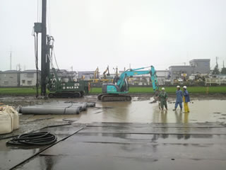 どれくらい低いのかにもよりますが、経験上30㎝~50㎝程度だと思います。夏の乾季はさほど影響は有りませんが、梅雨時期や雨季に入ると、近年の異常気象によって大雨が降ってしまい、またたく間に現場が水没し、施工不能に陥ったケースも多々ありました。こうなってしまうと、一旦溜まった水を水中ポンプで水を抜き、セメント系固化材による地盤改良工事をするか、良質土で盛土をしなければなりません。できれば全体を平らになるよう砂を盛り、現場全体がフラットであれば間違いありません。また現場の広さにもよりますが、狭い現場で地盤が低いと、杭打機を組み立てる際の支障になってしまいます。